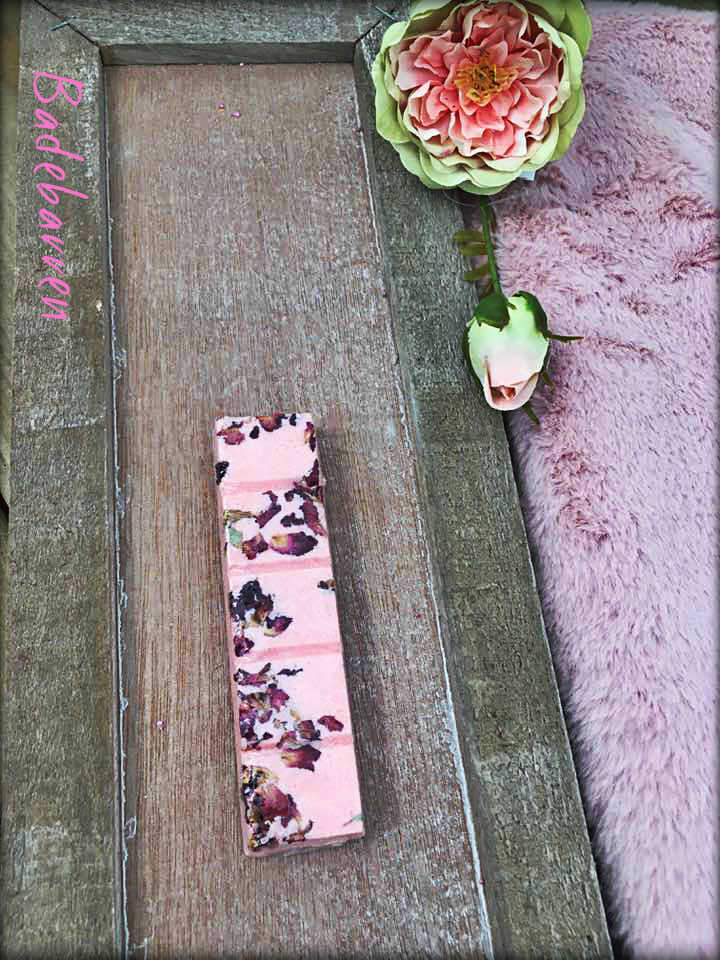 Ingredients: Sodium Bicarbonate (Natron), Citric Acid (Zitronensäure), Butyris Lac Powder (Buttermilchpulver)*, Zea Mays Starch (Maisstärke)*, Theobroma Cacao Seed Butter (Kakaobutter)*, Butyrospermum Parkii Butter (Sheabutter)*, Laureth-4 (Emulgator), Rosa Damascena Flower (Rosenblüten)*, CI16255 (Lebensmittelfarbe), Parfum frei von deklarationspflichtigen Allergenen